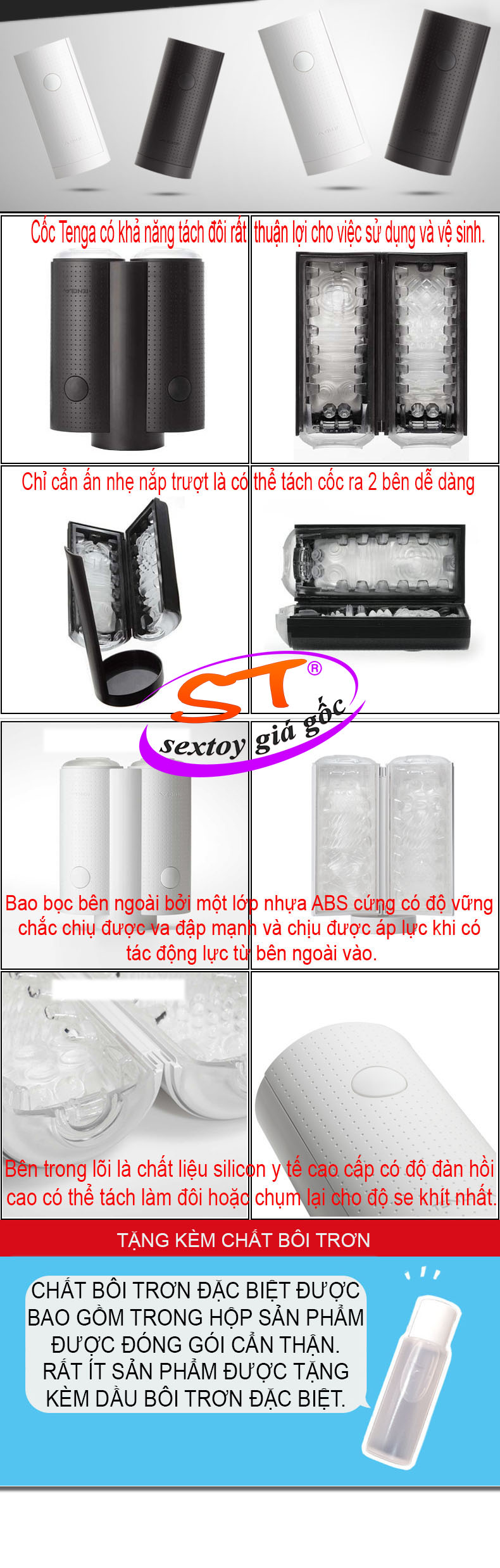 Cốc Tenga có khả năng tách đôi rất đặc biệt thuận lợi cho việc sử dụng và vệ sinh. Chỉ cẩn ấn nhẹ nắp trượt là có thể tách cốc ra 2 bên dễ dàng giống như chiếc đèn cụp cực kỳ sang trọng.