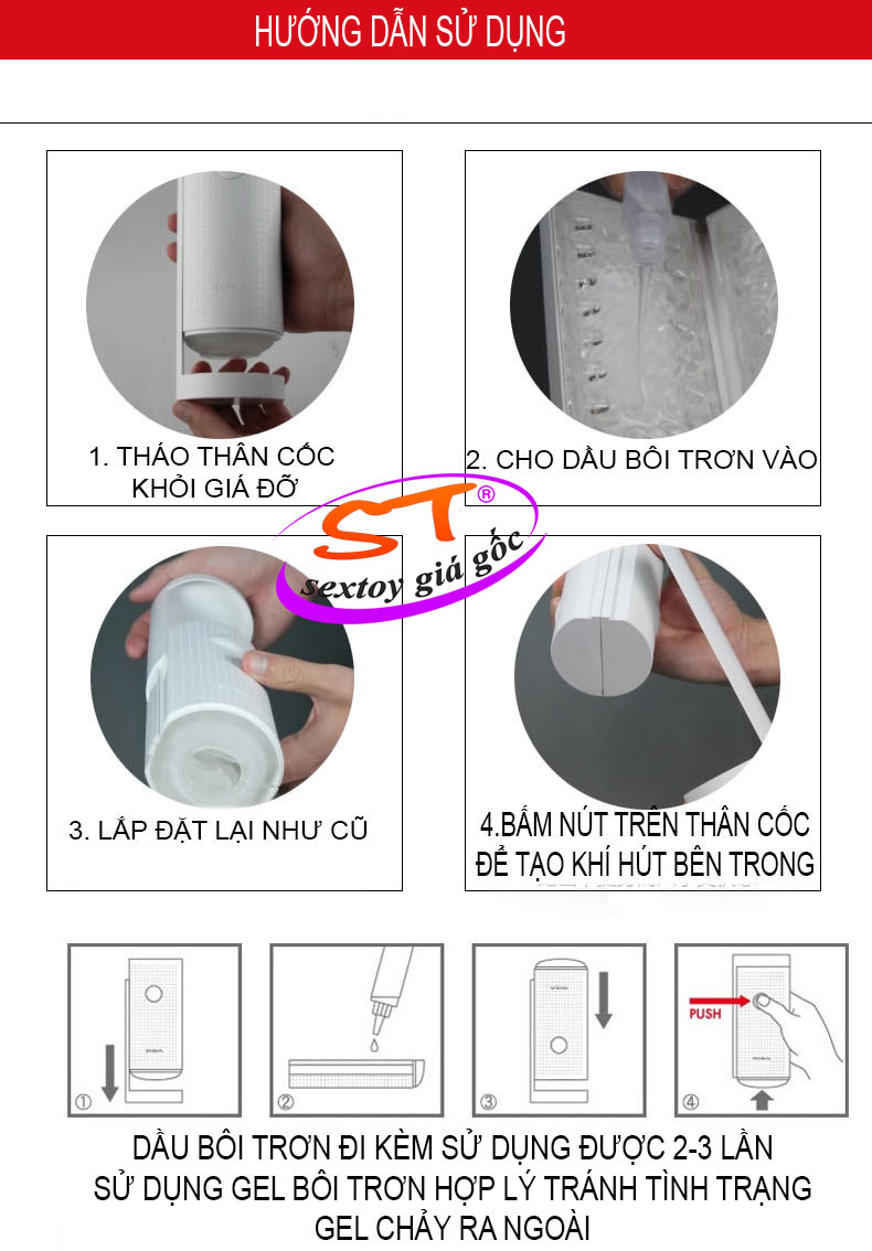 Sản phẩm thiết kế hiện đại nhưng lại cực kỳ dễ tháo chỉ cần trượt nắp để mở cốc, cho một chút gel bôi trơn bên trong cốc và nắp lại hoặc có thể sử dụng bao cao su, đưa dương vật đã cương cứng vào lỗ âm đạo của cốc để bắt đầu thủ dâm. Khi đạt cực khoái lên tới cao trào có thể ấn nút bóp khí để có độ mút chặt hơn tăng thêm khoái cảm hơn. Sau khi thủ dâm xong mở nắp cốc và xả sạch với nước để khô tự nhiên cho lần sử dụng tiếp theo.