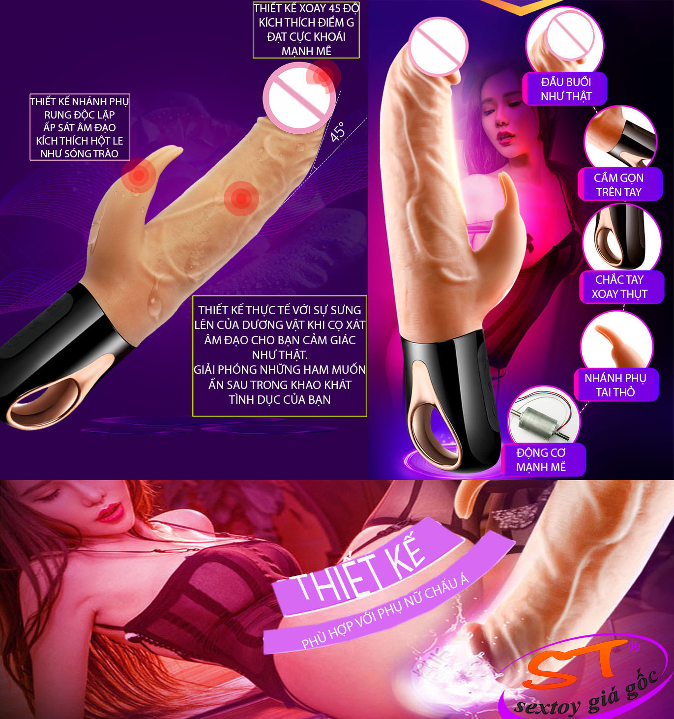 Với thiết kế sang trọng và đẳng cấp, sản phẩm có vẻ ngoài khá giống với dương vật thật của các anh, đặc biệt phần bao quy đầu thon gọn khá phù hợp cho rung kích thích bên ngoài âm đạo. Ngón tay cái ứng với nhánh rung tai thỏ giúp rà rà phía ngoài âm vật, hột le giúp “cô bé” khiến cho các nàng sung sướng đam mê tột cùng. Chức năng nhánh chính thụt ra vào giống chức năng đặc biệt của một người đàn ông, vì thế dù không có các chàng ở bên chị em vẫn có thể thỏa mãn nhu cầu của mình.