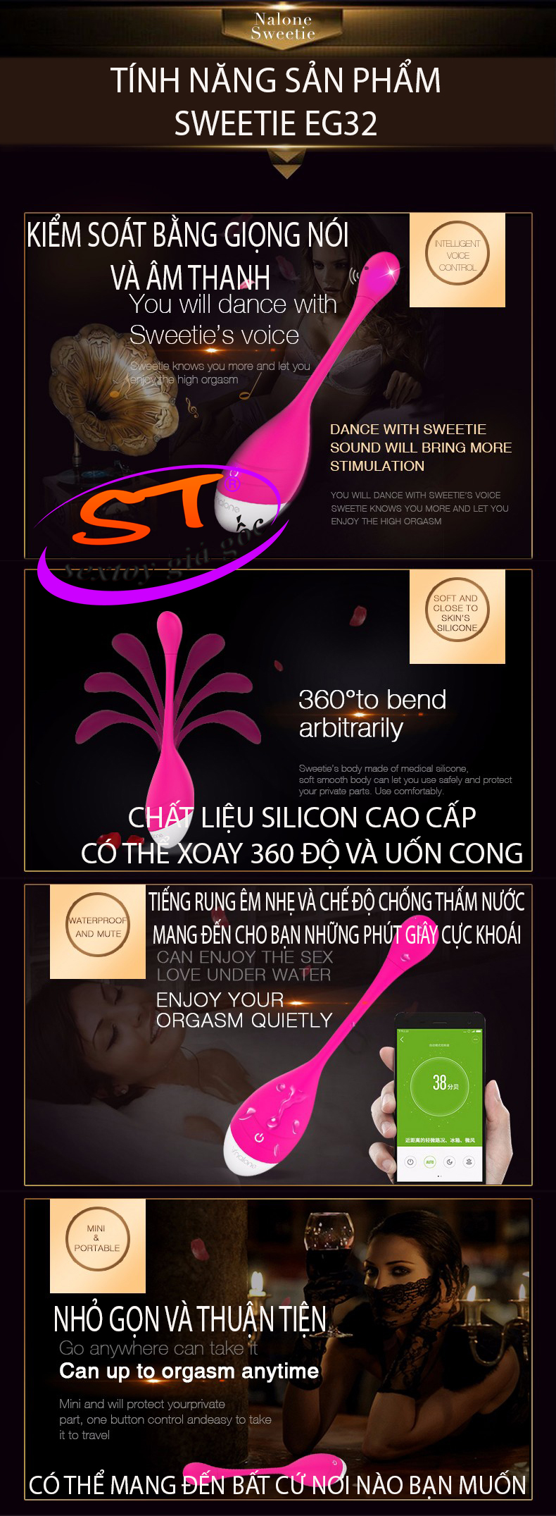 Trứng rung điều khiển xa Nolone Sweetie thuộc dòng đồ chơi người lớn thông minh với thiết kế hiện đại không dây, có thể điều khiển qua giọng nói với 7 cấp độ rung massager cực kỳ kích thích bạn tình. Trứng rung được ví như chú tinh binh mạnh mẽ khi lâm trận, dũng mãnh đi vào trong âm đạo , nhưng cũng cực kỳ chiều chuộng, vuốt ve cho các nàng nhằm kích thích hưng phấn tột đỉnh và gia tăng khoái cảm cho chị em. Chất liệu silicon mịn nên khi va chạm với âm đạo “cô bé” thấy thích thú và gần gũi giống như khi được quan hệ với “cậu nhỏ” của chàng.