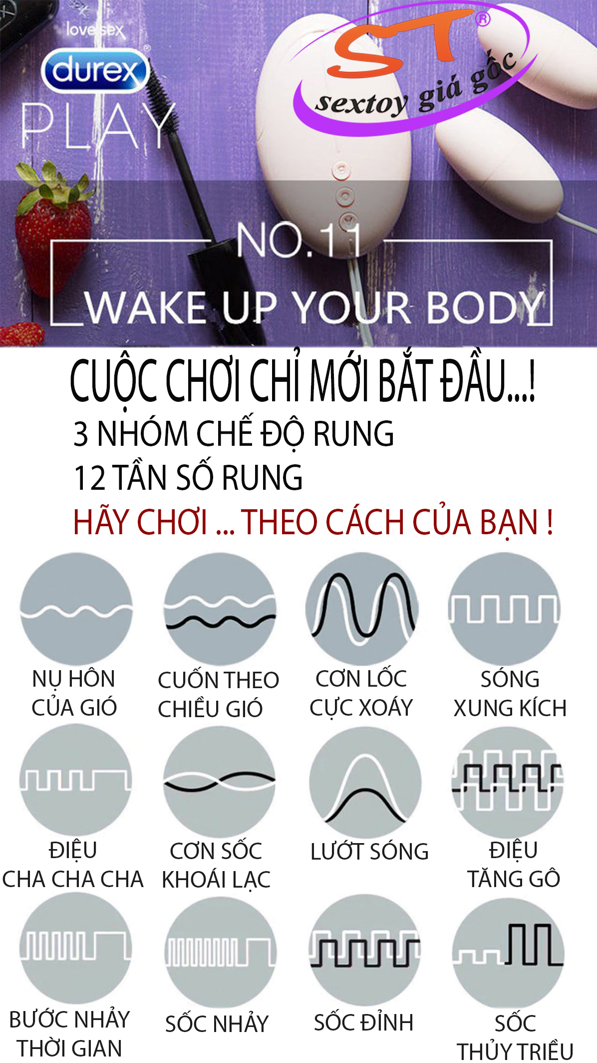 Trứng rung đôi Durex Dual Head Vibration được sản xuất theo tiêu chuẩn Quốc tế nhằm đem lại những lợi ích thiết thực, cũng như tăng cường sự đột phá mới mẻ trong chốn phòng the của các cặp đôi. Thiết kế tinh tế kết hợp của trứng rung đôi với 12 chế độ rung đa tần , mỗi một tần số rung là một trải nghiệm hoàn toàn mới, 12 cung bậc cảm xúc sẽ dần khiến nàng giải tỏa sinh lý một cách trọn vẹn nhất.