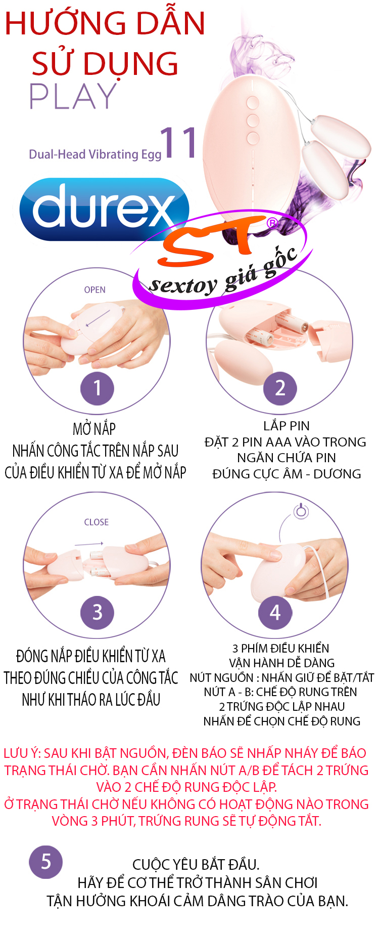 – Lắp 2 pin AAA vào điều khiển sau đó bật nút nguồn để khởi động trứng rung.